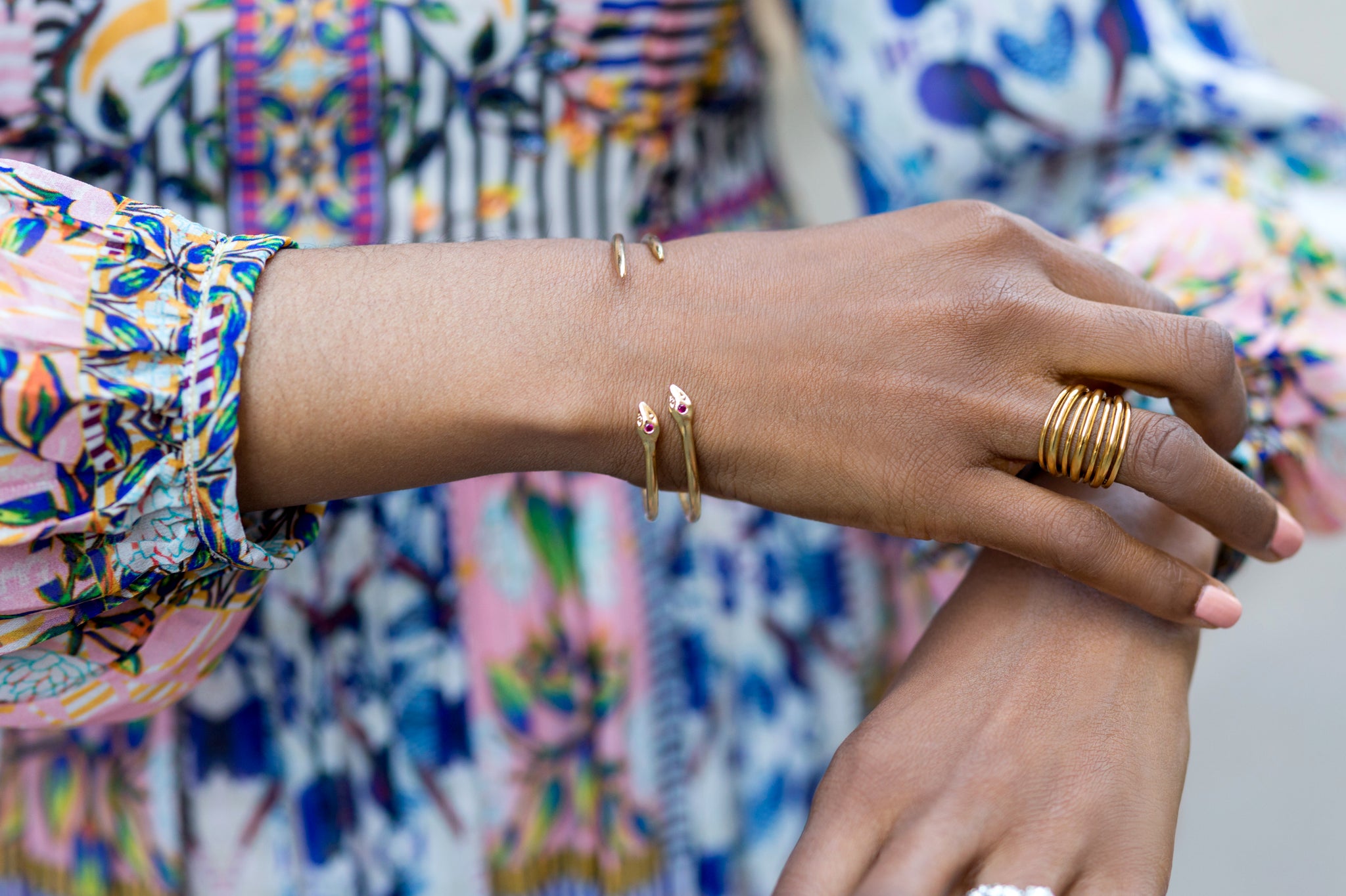 Snake Bangles, Nina Berenato; Layered Strand Ring, SOKO