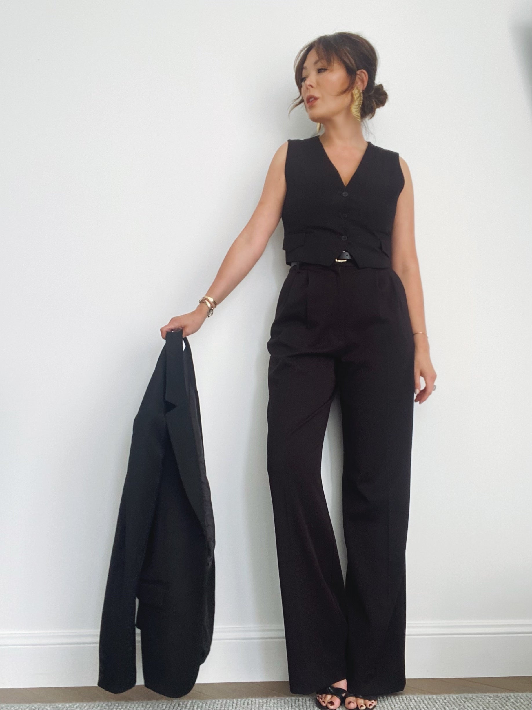 Finally the pièce de résistance in my travel wardrobe is a classic black three-piece suit. With sneakers and fun jewelry I could spend the day in Melbourne comfy and chic. But I could also throw on some heels and statement earrings that add some drama and edge for an instant elegant night out. All three pieces can be worn separately as well . Especially the oversized blazer which I throw over jeans or a slip dress.