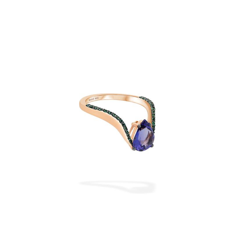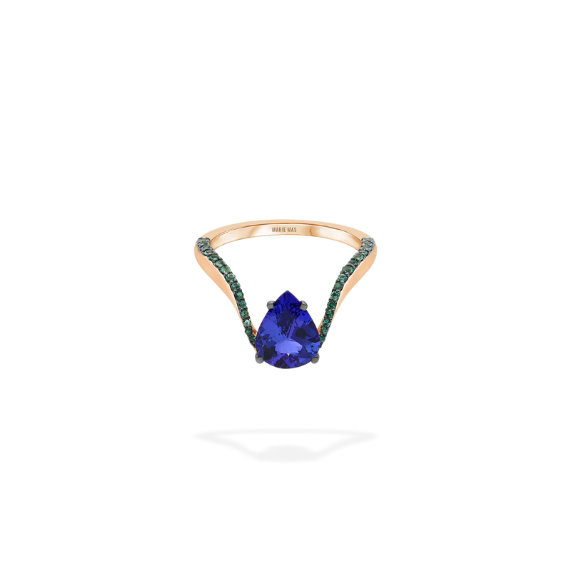 WHAT IT IS: Crafted in 18k rose gold, the ring is set with a pear-shaped Tanzanite, flanked on either side by 31 emeralds.