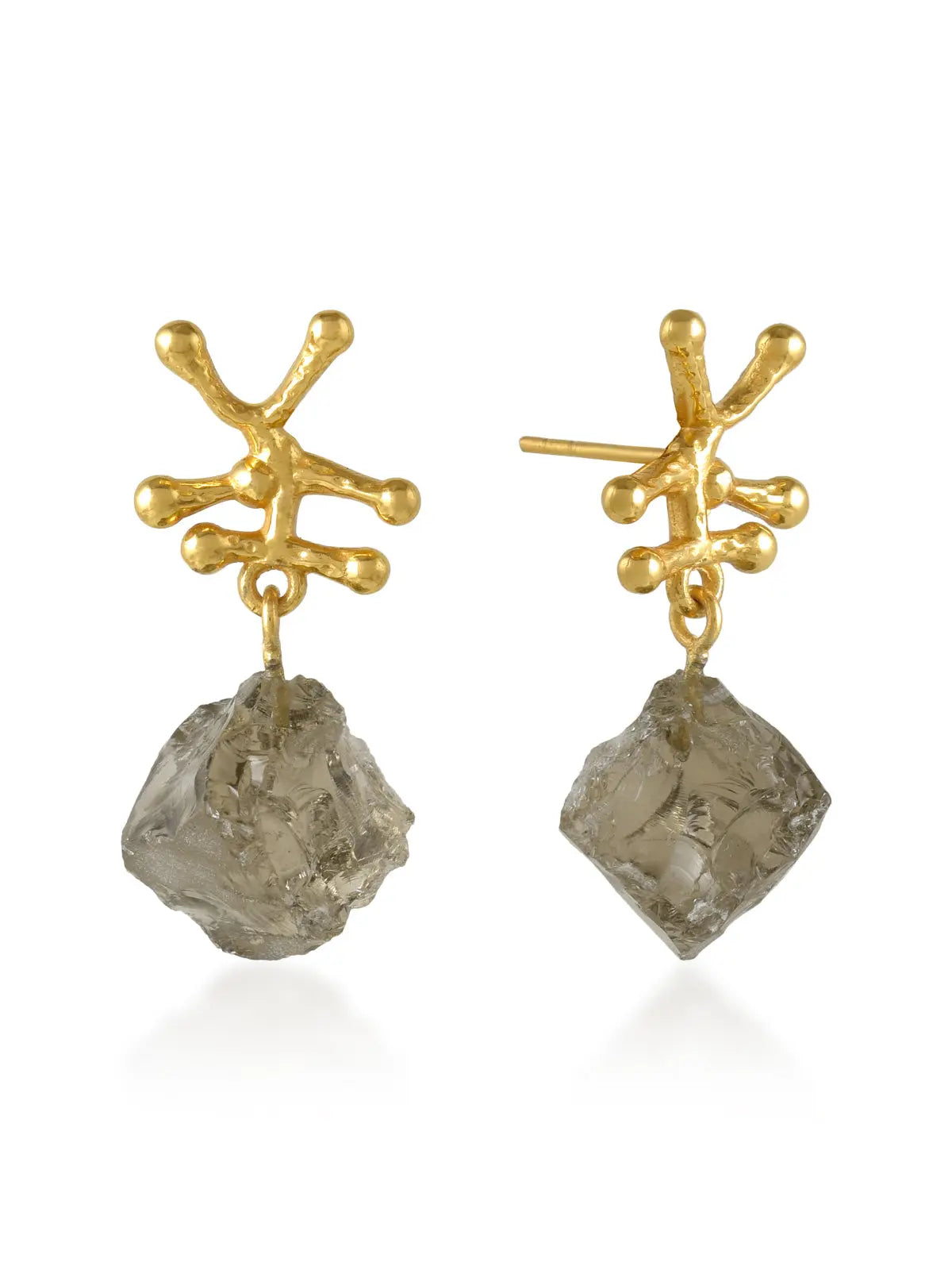 WHAT IT IS: Raw Crystal Drop Earrings Hang from a gold plated spike design