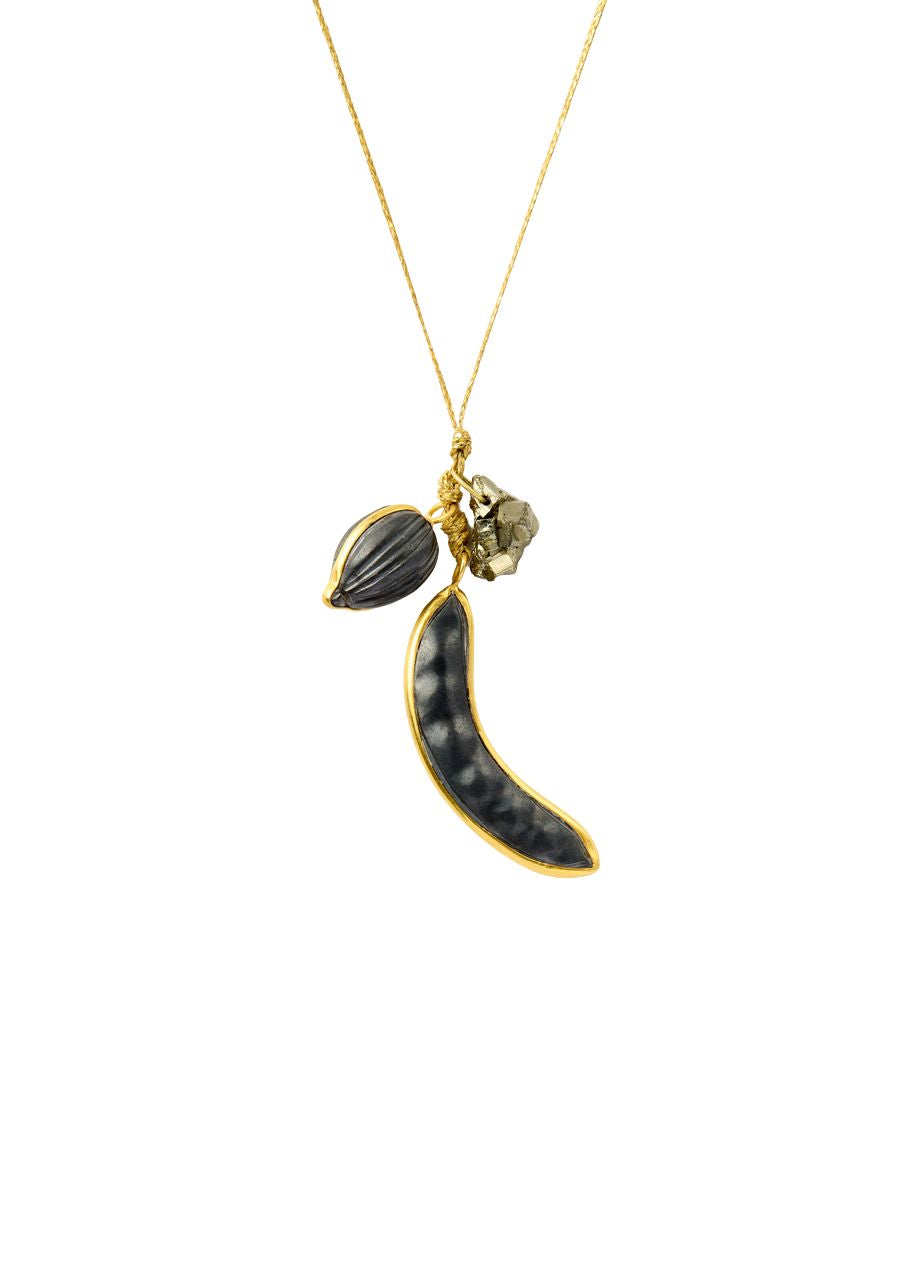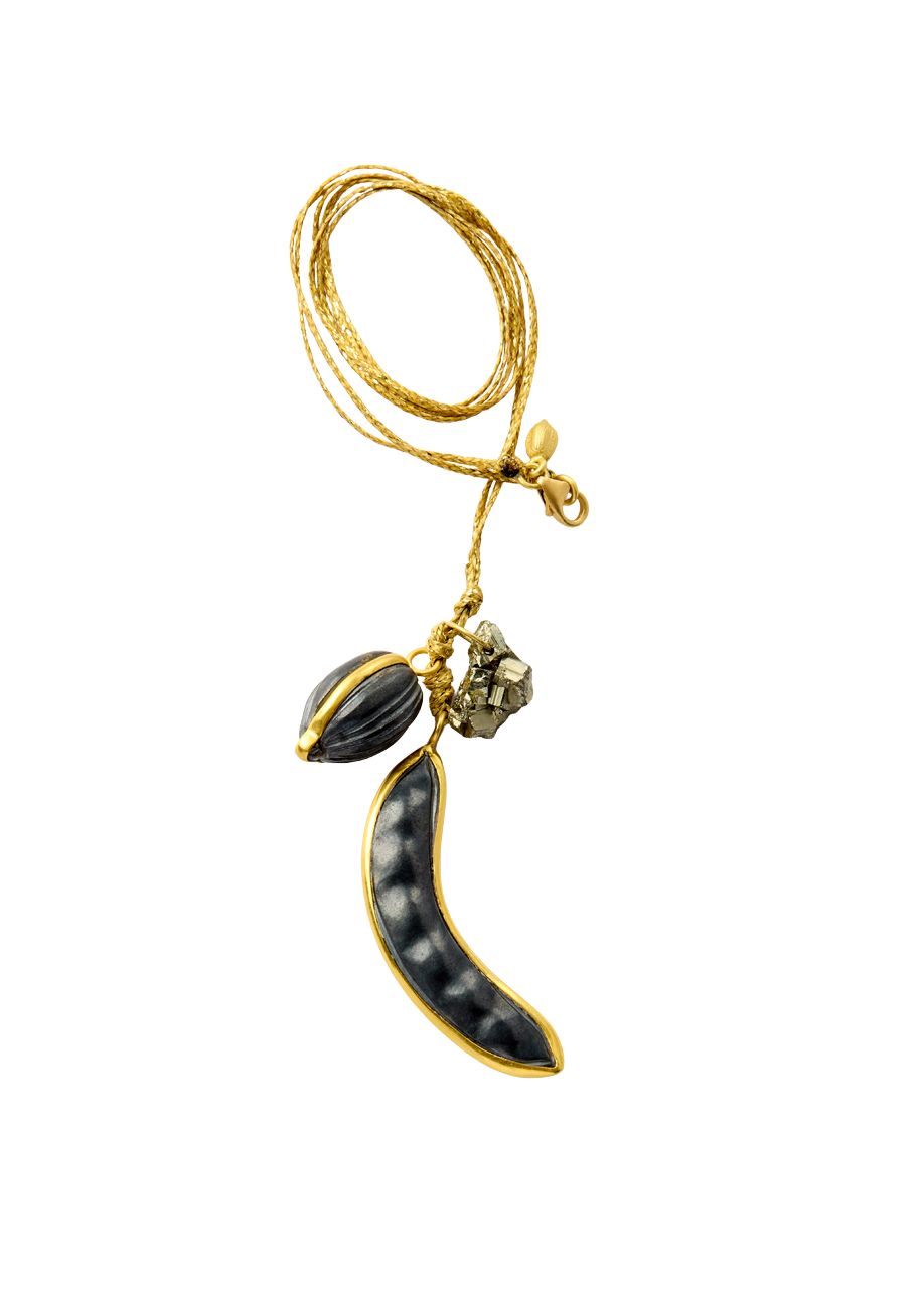 - Popular charms from the natural world: the plants that feed us, beans, fruit and pods; they flow with the rocks as a collection of talismanic charms on cord pendants.